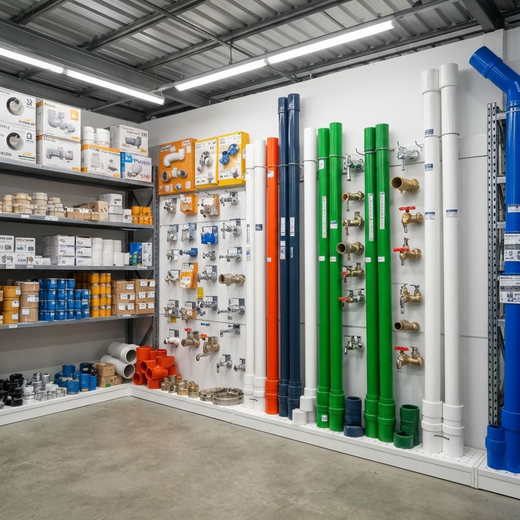 Tubos, conexões, registros, torneiras, válvulas e acessórios hidráulicos.